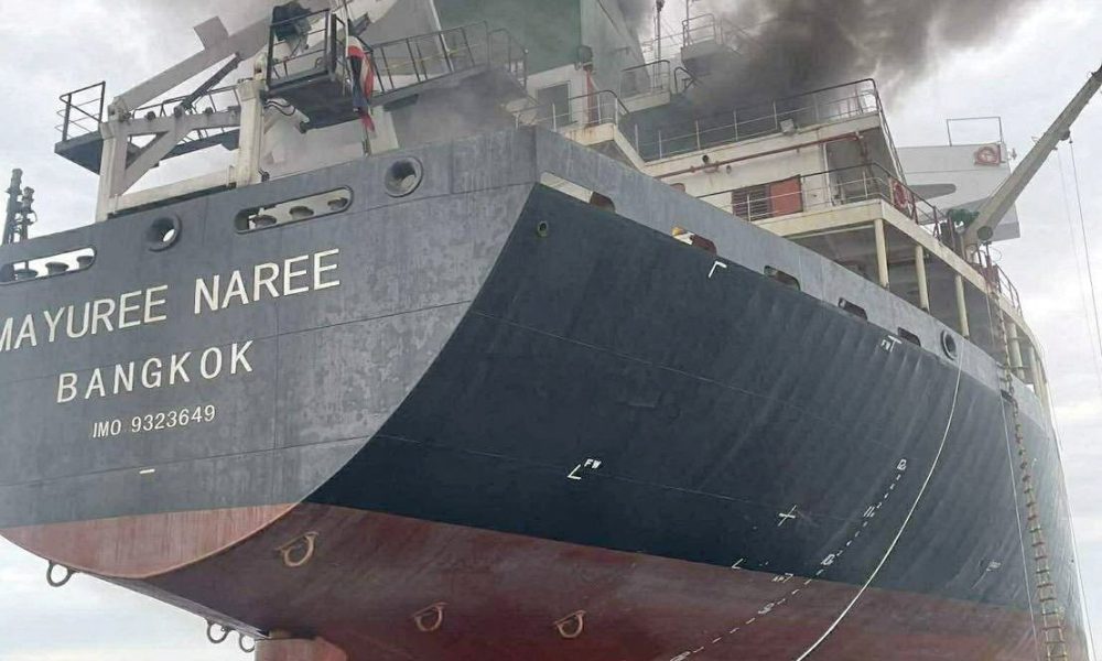 Fotos compartidas por la Armada Real Tailandesa mostraban una densa columna de humo negro saliendo de la popa del Mayuree Naree, de bandera tailandesa, con balsas salvavidas flotando en el agua.