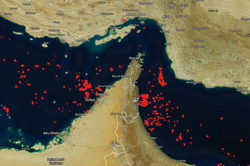 Según datos de la plataforma de seguimiento MarineTraffic, cientos de buques permanecen en el área, incluidos 426 petroleros, 34 portavehículos de gas licuado de petróleo y 19 buques de gas natural licuado, muchos de ellos detenidos durante la interrupción. La misma fuente registró movimientos iniciales tras el alto el fuego, con cruces puntuales en distintas franjas horarias.