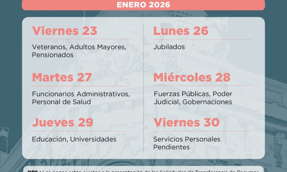 El Ministerio de Economía y Finanzas (MEF), a través de la Dirección General del Tesoro Público (DGTP), dependiente de la Gerencia de Gestión Financiera del Estado (GGFE) del Viceministerio de Administración Financiera (VAF), anuncia que este viernes 23 arrancará el cronograma de pagos de salarios y beneficios sociales correspondiente al mes de enero de 2026.